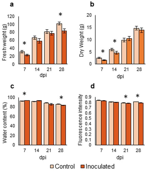 Inoculated seedlings had lower fresh weight than the control ones at all analyzed times (Figure 4a), but this difference was only significant at 7 and 28 dpi. Besides, inoculated plants had significantly lower dry weights than control plants at 7 and 14 dpi (Figure 4b). Water percentage was significantly higher in infected plants than in control plants at 7 dpi. However, the water percentage in control plants was significantly higher than that of inoculated plants at 28 dpi (Figure 4c). Fluorescence was slightly lower in the inoculated plants compared to control plants at all analyzed times, being statistically significant at 21 and 28 dpi (Figure 4d).