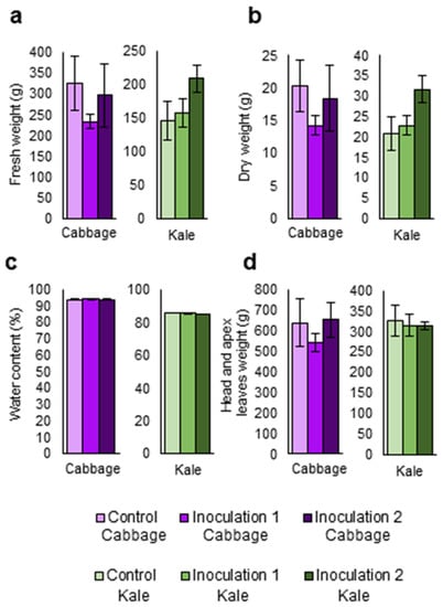 Inoculated plants were compared to control plants twenty-one days after the second inoculation. No significant differences were found in ANOVA among treatments (inoculation 1, inoculation 2, and control) for fresh and dry leaf weights (Figure 5a,b). Besides, there were no differences among treatments for water percentage (Figure 5c). Therefore, when adult plants are inoculated with Xcc, there is no evident effect of the disease on factors related to leaf biomass. To test the effect of Xcc in the final weight of the marketable products, we measured the cabbage heads’ weight and the kale apex leaves’ weight (Figure 5d). We did not find any evidence of a loss in weight for marketable products.