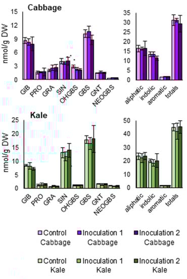 Glucosinolate contents of two Brassica oleracea crops inoculated with Xanthomonas campestris pv. campestris in a field trial. Glucosinolate concentration of leaves (GIB = glucoiberin; PRO = progoitrin; GRA = glucoraphanin; SIN = sinigrin; OHGBS = 4-hydroxyglucobrassicin; GBS = glucobrassicin; GNT = gluconasturtiin; NEOGBS = neoglucobrassicin; aliphatic = GIB + PRO + GRA + SIN; indolic = OHGBS + GBS + NEOGBS; aromatic = GNT; totals = total glucosinolates). Data represent the averages of 3 replicates for each crop: B. oleracea var. capitata (cabbage) and B. oleracea var. acephala (kale). Bars represent the standard errors.