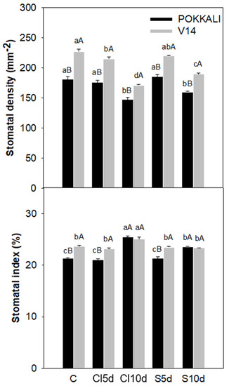 Comparisons of stomatal density and stomatal index in the flag leaf of rice control plants (C) and plants stressed by 5 dS m−1 (5d) or 10 dS m−1 (10d) of NaCl (Cl) or Na2SO4 (S). Plants belong to two distinct cultivars (Pokkali: salt-resistant and V14: salt-sensitive). Each value is the mean of three replicates per treatment and vertical bars are standard errors of the mean. Treatments followed by the same lowercase letter for a particular cultivar do not differ statistically. Cultivars followed by the same uppercase letter in a particular treatment do not differ statistically.