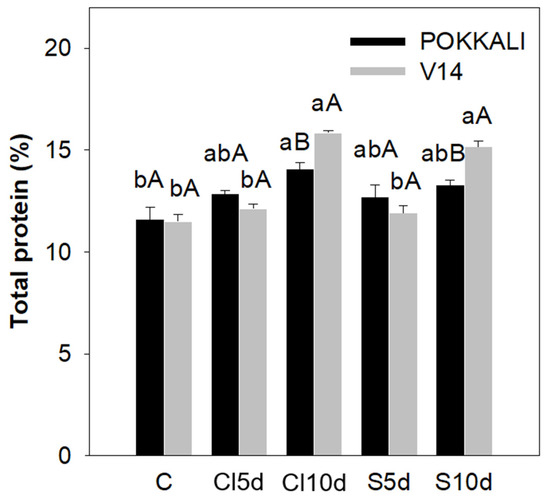 Total protein content in the rice grain of control plants (C) and plants stressed by 5 dS m−1 (5d) or 10 dS m−1 (10d) of NaCl (Cl) or Na2SO4 (S). Each value is the mean of three replicates per treatment and vertical bars are standard errors of the mean. Treatments followed by the same lowercase letter for a particular cultivar do not differ statistically. Cultivars followed by the same uppercase letter in a particular treatment do not differ statistically.