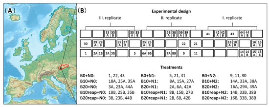 The field had been under conventional crop management for several years prior to the beginning of the experiment. This study was carried out from April to November 2018 on the biochar field experiment, which was established in 2014. The crop rotation from the beginning of the experiment (2014) was as follows: spring barley (Hordeum vulgare L.) in 2014, maize (Zea mays L.) in 2015, spring wheat (Triticum aestivum L.) in 2016, maize in 2017, and spring barley in 2018 (year of study). In 2014, the biochar field experiment included 9 treatments (in 3 replicates), with biochar application at a rate of 0, 10, and 20 t ha−1 (B0, B10, B20, respectively) combined with different N-fertilizer application rates depending on the grown crop’s requirements (N0, N1, N2 levels), applied from the beginning of the experiment as the main treatments (Table 2). A standard N-fertilizer (calcium ammonium nitrate with dolomite, LAD 27) was applied on 7 May 2018 after the beginning of the elongation of spring barley. The N0 fertilization level had no N-fertilizer application. The dosage at the N1 fertilization level was calculated according to spring barley requirements using the balance method, and the N2 fertilization level included 100% more fertilizer than the N1 level. The experimental field was not fertilized with any manure or organic fertilizer from 2014. The 27 plots (4 × 6 m) were arranged in a random design separated by 0.5-m-wide protective strips and, in the intermediate rows, by 1.2-m-wide access pathways (Figure 1). Then, in 2018, the original plots with former biochar application were divided into two parts (two subplots with dimensions 4 × 3 m), and the biochar was reapplied at the same rates as in 2014 (Table 2, treatments with “reap” in their acronym). Therefore, the studied period in 2018 included 15 treatments with 3 replicates (27 former plots + 18 reapplication subplots; in total, 45 plots). The entire experimental field was plowed to a depth of 0.15 m prior to the experiment in 2014 and also in 2018. A random treatment allocation followed; then, finally, biochar was applied to the soil surface and immediately incorporated into the 0–0.1 m soil layer using a combinator. Spring barley was planted on 9 April 2018 at a commercial seed density of 200 kg ha−1.