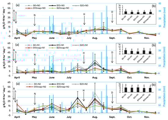 There was a clear increase of daily N2O emissions after N-fertilizer application on 7 May 2018, and they rose steadily up to mid-June and then started to decrease with a decrease of soil water content until the beginning of July (data not shown). A rain event of 14 mm, recorded on 10 and 11 July 2018, caused an increase in SWC measured on 12 July to the range of 17.4–28.6% vol. when compared to SWC measured a week before on 4 July (7.9–14.4% vol.). The mentioned precipitation event subsequently led to an increase in daily N2O emissions on 12 July 2018. The same trend was observed in August when the SWC measured on 31 July, ranging from 6.4–9.7% vol., increased up to 17.2–21.5% vol. when measured on 13 August after a rain event of 28 mm on 10 August 2018. Although all treatments showed a similar temporal N2O pattern, the heights of the peaks differed for different treatments. Almost all emission peaks observed in the biochar treatments (initial application and reapplication) were lower than in treatments without biochar application. These findings are also confirmed by the average daily N2O emissions over the whole studied period as the treatments with biochar at all N-fertilization levels (N0, N1, N2) were lower in comparison to treatments without biochar application (Figure 2b). However, differences among treatments were insignificant. Spatial variability within and among the plots could be a factor contributing to the inconclusive results, as reported in the study of Fangueiro et al. [91].