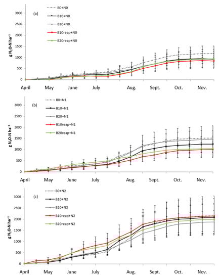 The lower emissions peaks from the plots with biochar amendment resulted in an increasing difference in cumulative fluxes between biochar-amended plots and control plots over the duration of the study (Figure 3). The results for the unfertilized treatments showed that all biochar treatments (B10+N0, B20+N0, B10reap+N0, and B20reap+N0) decreased (p ≤ 0.05) the cumulative N2O emissions by 21%, 23%, 28%, and 20%, respectively, compared to control (B0+N0). The cumulative fluxes from treatments at the N1 fertilization level were lower by 18% (p ≤ 0.05), 3%, 34% (p ≤ 0.05), and 31% (p ≤ 0.05) from treatments B10+N1, B20+N1, B10reap+N1, and B20reap+N1, respectively, compared to the control treatment (B0+N1). The same trend was found for treatments fertilized at the N2 fertilization level, where, again, all biochar-amended treatments (B10+N2, B20+N2, B10reap+N2, and B20reap+N2) decreased cumulative N2O emissions by 4%, 13% (p ≤ 0.05), 1%, and 8% compared to control (B0+N2). These results are in line with other field and laboratory studies that show that biochar can reduce soil-cumulative N2O [92,93,94].