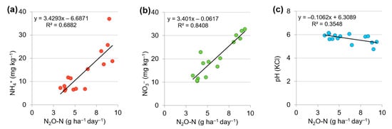Linear relationships according to regression analysis: (a) N2O and NH4+; (b) N2O and NO3−; (c) N2O and soil pH(KCl).