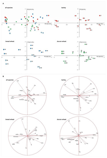 A multifactorial PCA analysis was conducted within each species to highlight the different behavior of the single genotypes considered (Figure 1). For barley, bread and durum wheat, the first two components accounted for 80.5%, 76.1% and 69.7% of variability, respectively. When we considered the species separately, it was observed that a similar behavior to that reported for the entire data set, with pigmented genotypes and commercial varieties differentiated on the first component and the sowing date differentiated principally on the second component. This was since, in all species, the TAC had positive loading on PC1, while the colorimetric coordinates (CIE L, b) and the morphological parameters (width and thickness) had negative loading. For all species, yield and PC were negatively and positively loaded to PC1 and vice versa to PC2. The G × Sd interaction was principally different for the behavior of some minerals (see Figure 1B).