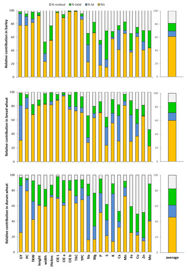 Considering the three species separately, the ANOVA showed some differences among barley, bread and durum wheats. In barley, the genotype (G) represented the main source of variation, explaining on average 61% of variability, while in bread and durum wheat, the percentages were 60 and 46%, respectively (Figure 2). In bread wheat, the content of zinc and phosphorus were affected exclusively by G (Table 4). The Sd effect represented on average about the 8%, 11% and 16% of variability in barley, bread wheat and durum wheat, respectively (Figure 2). Of the 22 traits analyzed, Sd was significant for 11 traits (GY, PC, TKW, length, CIE b, YPC, and the contents of Na, P, S, Ca and Zn) in barley, for 15 parameters (GY, PC, thickness, CIE L, CIE a, CIE b, TAC, YPC, Mg, S, K, Ca, Mn, Fe, Cu) in bread wheat, while in durum wheat, the Sd affected 13 traits among those measured (GY, PC, TKW, CIE L, CIE a, TAC, YPC, Na, Mg, P, S, K, Mn).