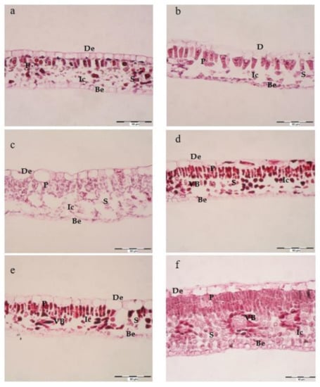 Cross section of ninebark leaf blade in plants of cv. Diable D’Or Mindia growing: (a) in vitro, (b) acclimated to ex vitro conditions—control—plants sprayed with water, (c) plants sprayed with ABA, (d) plants sprayed with water and given supplemental light, (e) plants sprayed with ABA and given supplemental light, (f) in vivo; De—adaxial epidermis, Be—abaxial epidermis, P—palisade parenchyma, S—spongy parenchyma, Ic—air spaces, VB—conductive bundle. Magnified × 40.