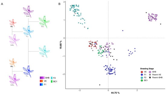Description of the crosses and genetic variance observed for five stages of blueberry breeding. (A) Heredogram depicting how the families used in this study were obtained, V. elliottii introgressions are represented in smaller scale and (B) Percentage of the variance observed for the first and second principal components for the analysis of the relationship matrix considering the V. elliottii (VE), F1, F2, BC1, and Southern highbush (SHB) families. The Pedigree-based matrix was computed using the AGHmatrix package [] considering Kerr et al. [] methodology.