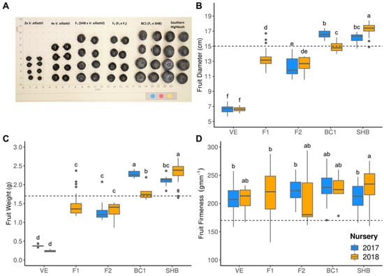 Fruit size, fruit weight, and fruit firmness observed for five stages of blueberry breeding. Fruit quality-related traits evaluated in five stages of blueberry breeding: V. elliottii (VE), F1, F2, BC1, and Southern highbush (SHB) families. (A) Berry size and color, (B) Breeding values obtained for fruit diameter, (C) Breeding values obtained for fruit weight, and (D) Breeding values obtained for fruit firmness. Treatments with the same letters are not statistically different at alpha = 0.05.
