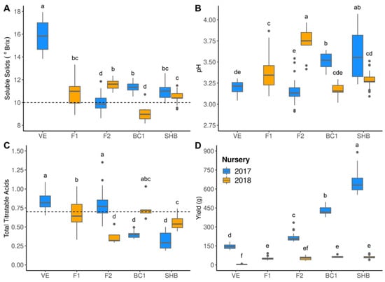 Beyond fruit weight, size, and yield, flavor is a fundamental component of fruit quality that affects consumer preference and marketability. Consumers are willing to pay more for better tasting varieties, justifying breeding for traits involved with flavor perception []. Flavor is a complex trait that is expensive to routinely evaluate in breeding programs []. However, sugar content and acidity greatly contribute to overall consumer liking and are easier and less expensive to phenotype than volatile profiles. Ferrão et al. [] verified that overall liking of blueberry is positively correlated with high sugar content and negatively correlated with high acidity. Here, we show that we can achieve commercial requirements for total soluble solids and TTA in the first stage of hybridization (i.e., F1). Our results show that some BC1 and F2 families presented sugar content and acidity equivalent to or better than the values presented by SHB individuals. Additionally, V. elliottii presented a significantly higher quantity of total sugars than SHB and all hybrid stages evaluated. However, V. elliottii also presented a significantly higher acidity and a lower pH than SHB and the hybrids. Similar results were also obtained by Norden et al. []. These results show that even though V. elliottii fruits presented more sugars, the perception of sweetness can be altered by the higher quantity of acids. V. elliottii germplasm could be further examined to screen for genotypes low in acidity (i.e., higher pH and lower TTA) with greater positive volatile and sugar contents, generating information for better stocks. Meeting these requirements could facilitate generation of hybrids with a better flavor perception and could further improve values for these traits.