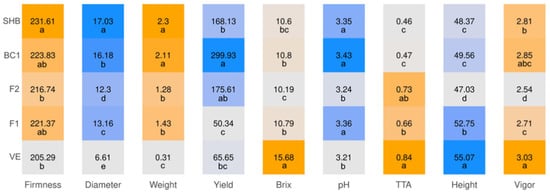Average values obtained by breeding stage for nine fruit quality- and plant fitness-related traits. Breeding values obtained across crop seasons for nine traits for five blueberry breeding stages: V. elliottii (VE), F1, F2, BC1, and Southern highbush (SHB) families. Darker colors (either blue or orange) correspond to higher values. Treatments with the same letters are not statistically different at alpha = 0.05.
