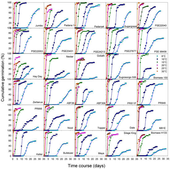 Cumulative germination time courses (solid curves) at different temperatures in 30 cultivars of biomass sorghum. Seeds were germinated at 8, 10, 15, 25 and 30 °C. Symbols represent the observed percentages with time.