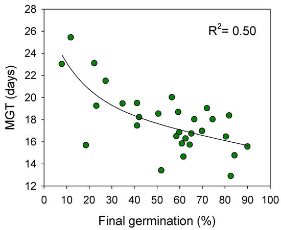 The relationship of final germination vs. mean germination time (MGT) at 8 °C was studied (Figure 2). An exponential decay model best fitted the data (R2 = 0.50), whose trend reveals that cold-tolerant cultivars, i.e., those best performing as the total number of seeds germinated at this temperature, tend to germinate faster than those susceptible (i.e., little germinating) to a low temperature.