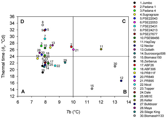 The observations of the graph divided in four quadrants allows us to point out the best combination, i.e., low Tb and low θT (Figure 3, quadrant A). A good combination of the two parameters (Tb and θT) corresponded to ‘Zerberus’, ‘Sucrosorgo 506’, ‘Jumbo’ and ‘PR811F’ (all in quadrant A). Contrastingly, in the upper right side of the figure (quadrant C), the worst combination corresponded to cultivars ‘HayDay’ and ‘PR895’.