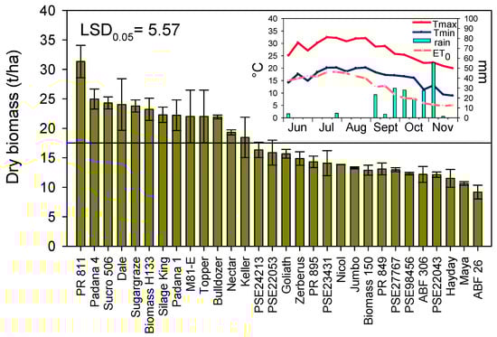 Final dry biomass measured in the thirty cultivars of sorghum under open field conditions was, on average, 17.51 ± 5.51 t ha−1 (Figure 4). A wide variability (CV 31.5%) among cultivars was calculated. Dry yield was maximized in ‘PR811’ (31.32 t ha−1), which significantly differed from all cultivars of sorghum examined. Low biomasses (<11 t ha−1) were harvested in ‘Maya’ and ‘ABF26’.