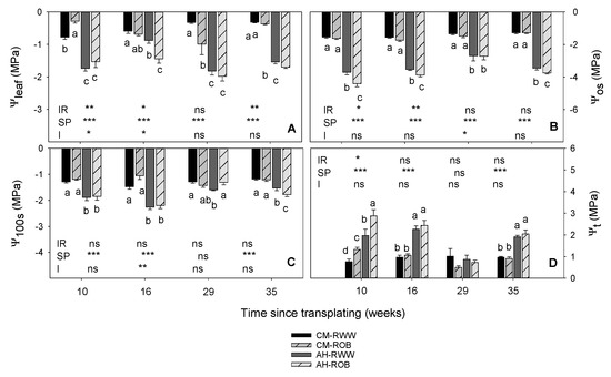 Leaf water potential (Ψleaf) (A), osmotic water potential (Ψos) (B), osmotic water potential at full turgor (Ψ100s) (C) and leaf turgor potential (Ψt) (D) in Crithmum maritimum (CM) and Atriplex halimus (AH), irrigated with reclaimed wastewater (RWW) and reverse osmosis brine (ROB). Results were from one way and two-way ANOVA tests in these parameters, for independent variables (irrigation, IR, and species, SP) and their interaction (I). Different lowercase letters indicate significant differences between treatments according to Duncan’s test at p ≤ 0.05. * p < 0.05, ** p < 0.01 and *** p < 0.001. p > 0.05 non-significant differences are indicated by “ns”.