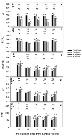Internal CO2 concentration (Ci) (A); The excitation capture efficiency of open centers (Fv′/Fm′) (B); PSII effective quantum yield (PhiPSII) (C); Photochemical quenching coefficient (qP) (D); and the apparent electron transport rate (ETR) (E) in Crithmum maritimum (CM) and Atriplex halimus (AH) irrigated with reclaimed wastewater (RWW) and reverse osmosis brine (ROB). Results were from one way and two-way ANOVA tests in these parameters, for independent variables (irrigation, IR, and species, SP) and their interaction (I). Different lowercase letters indicate significant differences between treatments according to Duncan’s test at p ≤ 0.05. * p < 0.05, ** p < 0.01 and *** p < 0.001. p > 0.05 non-significant differences are indicated by “ns”.