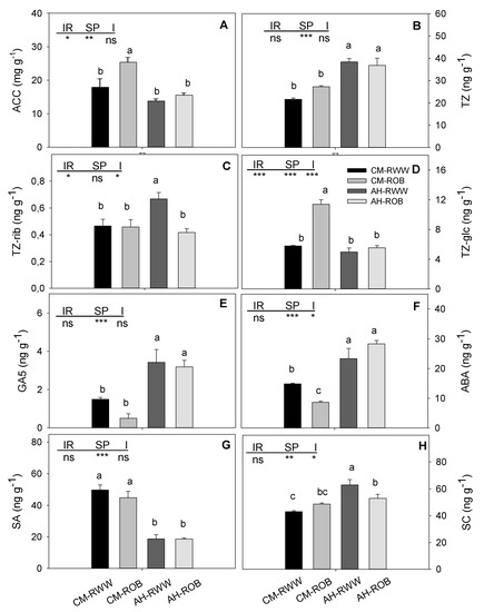1-Aminocyclopropane-1-carboxylic acid (ACC) (A), cytokinins (TZ) (B), (TZ-rib) (C), (TZ-glc) (D), gibberellins (GA5) (E), abscisic acid (ABA) (F), salicylic acid (SA) (G) and scopoletin (SC) (H), in Crithmum maritimum (CM) and Atriplex halimus (AH) irrigated with reclaimed wastewater (RWW) and reverse osmosis brine (ROB). Results were from one way and two-way ANOVA tests in these parameters, for independent variables (irrigation, IR, and species, SP) and their interaction (I). Different lowercase letters indicate significant differences between treatments according to Duncan’s test at p ≤ 0.05. * p < 0.05, ** p < 0.01 and *** p < 0.001. p > 0.05 non-significant differences are indicated by “ns”.