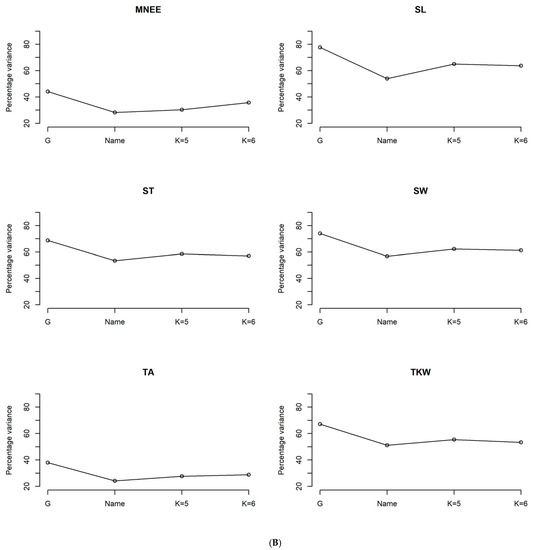 3.3. Phenotypic Characterization Based on the Genetic Structure Using the Optimal Number of Sub-Population (K = 6)