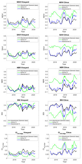 In this section, we show the temporal behaviour of selected spectral indices over abandoned and active parcels. For the sake of brevity, we only show two of the most representative classes, vineyard and citrus (Figure 2). From VI time series, one observes that the phenological profile of the abandoned classes and the active one are shifted with respect to active crops. This suggests that new vegetation species appear in the parcel once it is abandoned, allowing to differentiate better between abandoned and active crops. Another feature of vegetation that allows to differentiate cropland from scrubs is fraction of vegetation cover (FVC). For instance, arable land parcels have strong seasonal variations due to high FVC, which results in higher separability from abandoned crops. Lastly, SIs values of CI are high throughout all the year (or lower, for BSI), which can be the main reason for the high separability of abandoned classes, using either single images or multitemporal inputs.