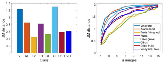 Jeffries–Matusita (JM) distances between active crop classes and the general class containing all the abandoned samples. To the left, the average distance is shown. To the right, the increase in JM distance as more images are stacked together is plotted.