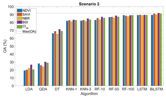 Lower accuracy values were achieved in the most challenging problem (scenario 2, Figure 5) considering eight classes of abandoned fields. In this case, we obtained the highest accuracy with BiLSTM trained with the BSI dataset, resulting in OA, whereas the accuracies of the remaining algorithms were below 90%. Here, the confusion is higher among active crop classes, with lower UA and PA for FV, DF, OL and VO, and also active vineyards.