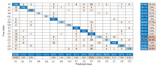 Results for separability analysis are shown in Table 3. The first 8 × 8 box accounts for JM distances between abandoned classes (e.g., VI − AL), which corresponds to the aforementioned scenario 1, meanwhile the full table corresponds to scenario 2. The corresponding active classes are denoted with an additional subscript (e.g., ). Since the JM are symmetric, the lower part of the table corresponds to the average distance between pairs of classes, and the upper part to the distances calculated when 15 images are stacked together.