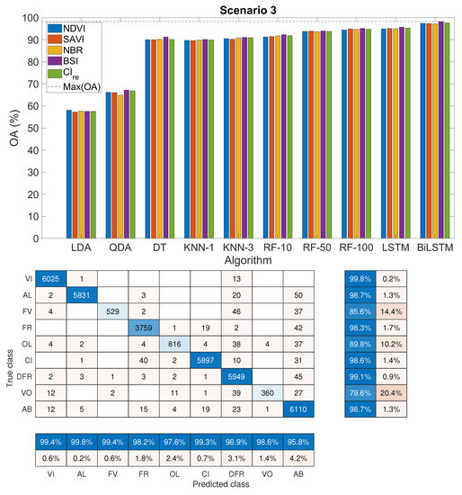 For scenario 1 (Figure 4), the obtained accuracies are high (OA ), except for the parametric classifiers (LDA and QDA). The best performing algorithms are RF with 100 trees (RF-100), and deep LSTM and BiLSTM networks, with accuracies higher than , with the best case being the model obtained with BiLSTM and the BSI dataset, with a OA. We also noted that in this first problem, all the indices performed similarly. However, NBR showed slightly lower OA values (1–2%) than the other models, which could be attributed to the higher similarity of the NBR temporal profiles for all the abandoned crops. The per-class User Accuracy (UA) values were high, with the exception of the VO class (86.4%). The lowest per-class Producer Accuracy (PU) values were found in DF, FV and AL classes (with 67.8%, 68.9% and 82.6% PU, respectively). These classes present large omission errors due to incorrect assignations to VI, the class with the highest number of samples.