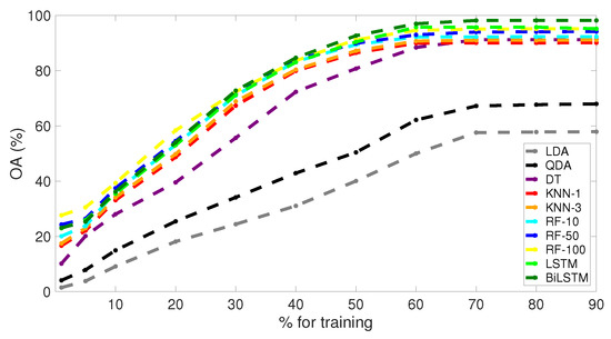 Lastly, with respect to the algorithms used in the study, we observed that in this particular classification task deep learning architectures were able to extract the most information from the training data, and achieved the highest accuracy in all the proposed experiments. This was especially the case in the third scenario, where training datasets disposed the abundant samples for the majority of classes. It is worth mentioning that in this scenario, BiLSTM overall accuracy was 2% higher than LSTM one. The fact that this network is able to learn from both past and future states in such a complex way is something that can set it apart from the rest of the classification algorithms. However, random forest performed even better than deep learning architectures in scenarios with limited training data, being a good alternative to DL algorithms.