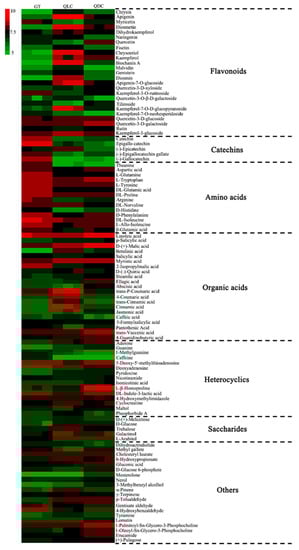 Sour and sweetness are not the main taste characteristics of C. sinensis green tea, but they can supplement and adjust the overall taste of C. sinensis green tea [25,34]. In general, organic acids and saccharides are the main sour and sweetness components in C. sinensis green tea [25,34]. As shown in Figure 3, the relative abundance of most organic acids in QLC and QDC were significantly higher than those in GT, and the relative abundance of D-glucose, trehalose, and galactinol in QLC and QDC were significantly higher than GT. The difference of organic acids and saccharides may be an important factor in the formation of the difference of sour and sweetness taste in the three tea samples. Heterocyclics and other components were no obvious change rules in the three tea samples. Caffeine, which is the main heterocyclic in C. sinensis leaves, accounts for 2%~5% of dry weight, and is the main factor associated with the bitterness of tea infusions [35]. In Figure 3, the relative abundance of caffeine in GT is significantly higher than QLC and QDC.