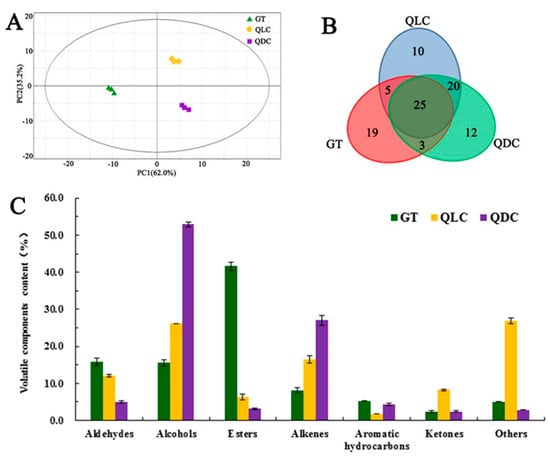 HS-SPME-GC-MS was used to identify the volatile components of the three tea samples, and 94 major volatile components were detected (Table S2). To provide an insightful overview of the variation in volatile components, a PCA score plot was constructed on the integrated GC-MS datasets of the three tea samples. The volatile components of the three tea samples were well discriminated, all replicates from each sample clustered together and were separated from other tea samples, as shown in Figure 4A (PC1 = 62.0% and PC2 = 35.2%). In brief, the tea samples (GT, QLC, and QDC) were grouped into three distinct areas, indicating that the types and component ratios of the volatile components in the three tea samples were remarkably different. The volatile components in the three tea samples (GT, QLC, and QDC) were compared using a Venn diagram (Figure 4B). In total, 94 major volatile components were detected, and 25 were detected in all the samples; thus, they were deemed common volatile components. The number of differential volatile components found exclusively in each tea sample was 19 for GT, 10 for QLC, and 12 for QDC. These components were considered as the defining volatile components for each sample.