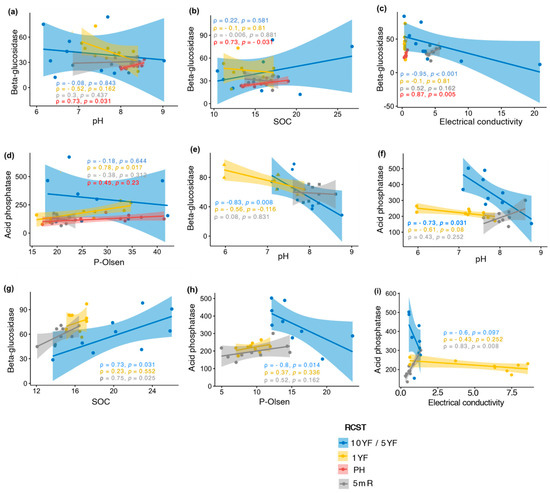 For the identification of soil chemical properties that drive the significant differences in β-glucosidase and acid phosphatase activities observed in both study locations, a Spearman rank-order correlation was performed. In Chokwe, a positive significant (p < 0.05) correlation was observed between pH and β-glucosidase activity in the PH site (rho = 0.73, p = 0.031), whereas a negative association was observed between pH and β-glucosidase activity in the corresponding 5YF site (rho = −0.83, p = 0.008) (Figure 1a,e). In addition, significant (p < 0.05) positive associations between β-glucosidase activities and SOC were observed for PH in Umbeluzi and 5YF in Chokwe (Figure 1b,g). Interestingly, in the 10YF field in Umbeluzi, β-glucosidase activity correlated negatively with EC (rho = −0.95, p < 0.001), but correlated positively with EC in PH (rho = 0.87, p = 0.005) (Figure 1c). Similarly, acid phosphatase activity was positively correlated with P-Olsen in 1YF soils in Umbeluzi (rho = 0.78, p = 0.017) (Figure 1d), but negatively correlated with P-Olsen for 5mR in Chokwe (rho = −0.80, p = 0.014) (Figure 1h). In Chokwe, a negative correlation was observed between acid phosphatase activities and pH in soils from 5YF (rho = −0.73, p = 0.031) (Figure 1f), while a positive correlation was observed between acid phosphatase activity and soil electrical conductivity in soils from 5mR (rho = 0.83, p = 0.008) (Figure 1i).