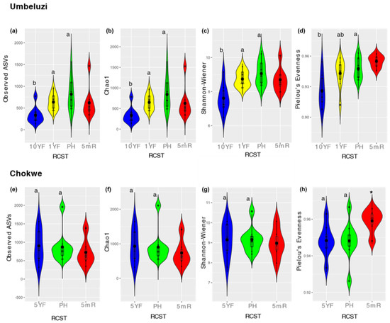 Observed ASVs, Chao1, Shannon–Wiener index of diversity and Pielou’s evenness in Umbeluzi (a–d) and Chokwe (e–h). Black-filled dots depict mean values on the boxplot. Plots for 10YF, 1YF or PH with different superscript letters for each location are significantly different (Bonferroni adjusted p < 0.05) based on Kruskal–Wallis or Mann–Whitney test. 5mR is only compared to PH. Plots for 5mR with asterisks (*) is significantly (Wilcoxon rank-sum test p < 0.05) different from PH.