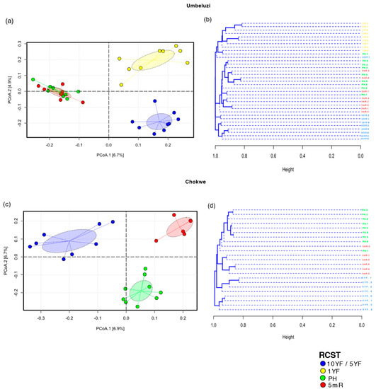 Multivariate differentiation of bacterial communities in rice cultivation statuses or time points (RCST). (a,b) Umbeluzi (c,d) Chokwe. Principal coordinate analysis (PCoA) plot and unweighted pair group method with arithmetic mean (UPGMA) cluster dendrogram are based on Bray-Curtis dissimilarities. Dotted lines in the PCoA plot show the distance of every sample to its group centroids in multivariate space, while ellipses show 95% confidence intervals (standard error) in multivariate space around group centroids. 10YF, ten years fallow; 5YF, five years fallow; 1YF, one-year fallow; PH, postharvest; 5mR, five months off-season time point. “10YF/5YF” denotes fallow fields in Umbeluzi or Chokwe, respectively. The differences in multivariate space among RCSTs in Umbeluzi and Chokwe are significant (PERMANOVA p < 0.05; see Table S1).