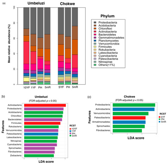 Dominant and differentially abundant (false discovery rate (FDR)-adjusted p < 0.05, least discriminant analysis (LDA) > 4.0) phylotypes at phylum taxonomic rank. (a) Mean relative abundance (b) differentially abundant phyla in Umbeluzi and (c) Differentially abundant phyla in Chokwe. 10YF, ten years fallow; 5YF, five years fallow; 1YF, one-year fallow; PH, postharvest; 5mR, five months off-season time point.