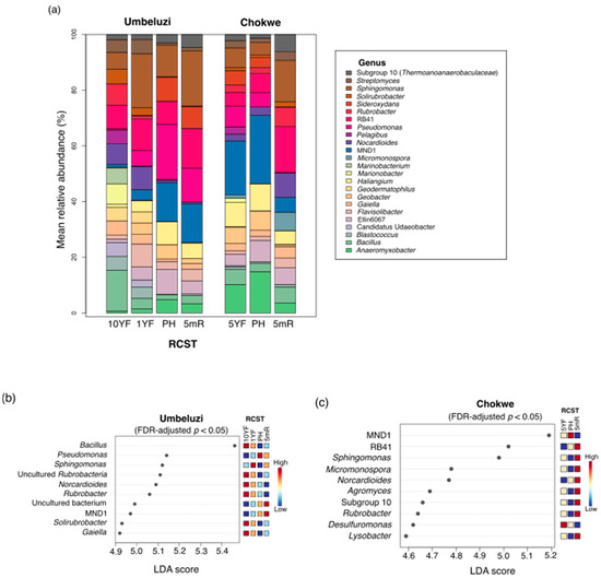 Relative abundance and differentially abundant phylotypes at the genus taxonomic rank. (a) Mean relative abundance. (b) Top 10 differentially abundant phylotypes (FDR-adjusted p < 0.05, LDA > 4.0) in Umbeluzi. (c) Top 10 differentially abundant phylotypes (FDR-adjusted p < 0.05, LDA > 4.0) in Chokwe. In Figure 4a, phylotypes with relative proportion less than 0.01 (1%) and phylotypes unclassified at the genus taxonomic level were excluded. Family names are in parenthesis for some phylotypes without standard genus names. See Tables S2 and S3 for other differentially abundant phylotypes. 10YF, ten years fallow; 5YF, five years fallow; 1YF, one year fallow; PH, postharvest; 5mR, five months postharvest recovery or pre-planting.