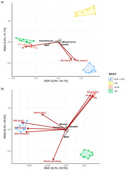 To determine differentially abundant phylotypes (false discovery rate (FDR)-adjusted p < 0.05, least discriminant analysis (LDA) score > 4.0) among RCST at the phylum and genus taxonomic ranks, the least discriminant analysis (LDA) effect size (LEfSe) [60] was performed using MicrobiomeAnlayst [61]. To determine the physicochemical properties that influence bacterial communities of these soils, a constrained redundancy analysis (RDA) was performed on Hellinger-transformed environmental and bacterial data using ampvis2 and vegan R packages. The significance of the constrained RDA axis was determined based on a permutation test using the function “anova.cca ()” in the vegan package.