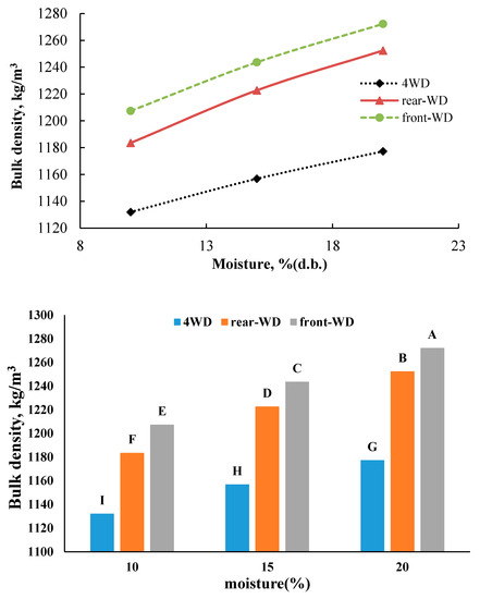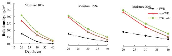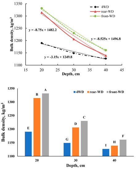 Changes of bulk density relative to the depth, moisture (d.b.) and driving system type. (different letters shows significant difference between treatments).