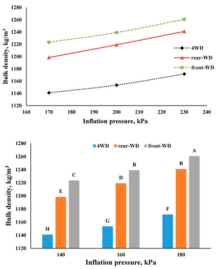 Finally the two-way effect of the drive system and tire inflation pressure on soil compaction was investigated (Figure 7). For all drive systems soil compaction was increased linearly with tire inflation pressure. The difference between the 4WD system and two other systems was very high. The highest soil density of 1261 kg/m3 was occurred at inflation pressure of 180 kPa and soil density dropped to 1172 kg/m3 as the 4WD system was used, resulting in a compaction decrement of 4.4%. This difference between the systems was constant at all pressures.