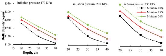 Changes of bulk density relative to the depth, moisture (d.b.) and inflation pressure (different letters shows significant difference between treatments).
