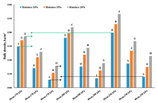 Soil compaction increment due to increasing moisture can be attributed to increment adhesion between soil particles, soil particles are pressed together due to applied pressure and the moisture makes their position to be maintained after pressure removal. Increasing the soil moisture under critical values resulted in a high soil compaction because the water in the soil acts as a lubricant. This phenomenon was very important in heavy and cohesive soils in soil compaction increment [40]. Additionally, at a low moisture content of 10% after passing each wheel the soil returned a few millimeters upward and thus the final soil compaction reduced, but at a moisture content of 20% soil recursion did not occur because of an increment of soil cohesion, then the presence of moisture decreases soil recursion after removing inserted pressure. The effect of moisture on the increasing soil compaction and its effect in subsoil compaction in the work of other researchers has been reported [41,42,43].