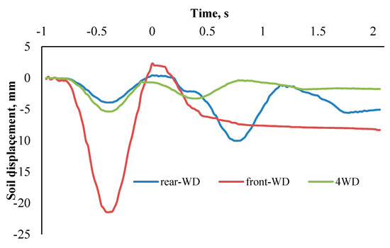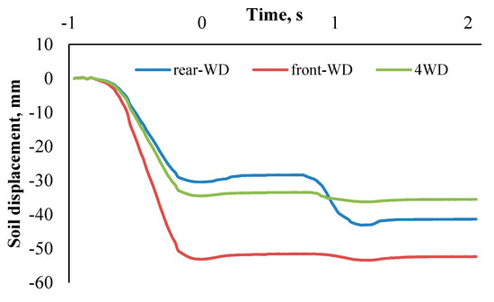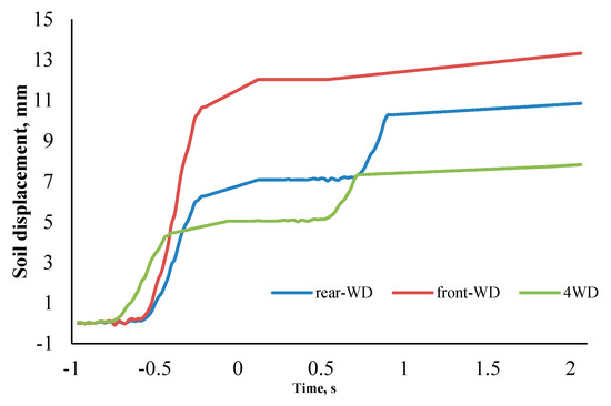 In the case of the FWD system by approaching the front wheel, which was the sole drive tire that included more slippage of 24% and had more engagement with the loose soil and as a result a more dynamic load was on that, more soil compression was created in comparison to the 4WD mode. Additionally, more soil elongation was observed relative to the 4WD case when the front tire was on the sensor. The rear wheel did not show any significant effect on longitudinal soil displacement.
