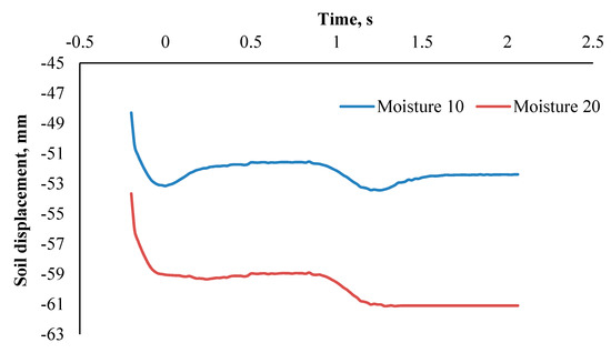 It appears an interesting issue with comparing soil displacement in vertical direction curves (Figure 13) that correspond to the mode of FWD in soil moisture of 10% and 20%, respectively. At a moisture content of 10% after passing each wheel over the soil, the soil returned a few millimeters upward and thus the resulted soil compaction reduced, but at a moisture content of 20% soil recursion did not occur because soil particles stick to together due to the presence of moisture and causes the soil layers to remain constant in their places.