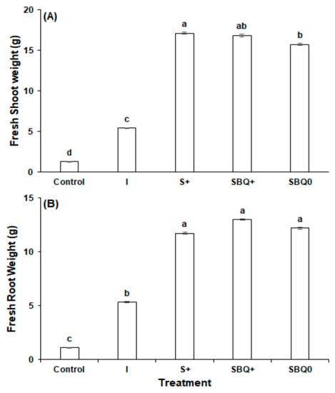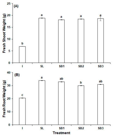 Fresh weight of radish in experiment 2: (A) Shoot weight (B) root weight. All different letters are significant at p < 0.05.