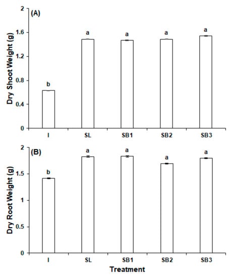 The biostimulants significantly improved radish biomass over the group treated with inorganic fertilizer. The measurement with the largest percent increase as a result of the biostimulant application was fresh shoot biomass, which statistically significantly increased in SL (172.9%), B1 (163.3%), B2 (167.9%), and B3 (171.2%) (Figure 1A). The metric with the second largest percent increase was dry shoot biomass, which increased in SL (136.4%), B1 (132.7%), B2 (136.2%), and B3 (144.6%) (Figure 2A). Similarly, in SL, B1, B2, and B3, fresh root biomass was increased by 64.7%, 60.2%, 45.8%, and 50.4%, respectively (Figure 1B). Dry root biomass was the metric with the lowest percent increase, but the measurement was statistically significantly improved in SL (29.1%), B1 (29.5%), B2 (19.8%), and B3 (27.1%) (Figure 2B). All different letters are significant at p < 0.01.