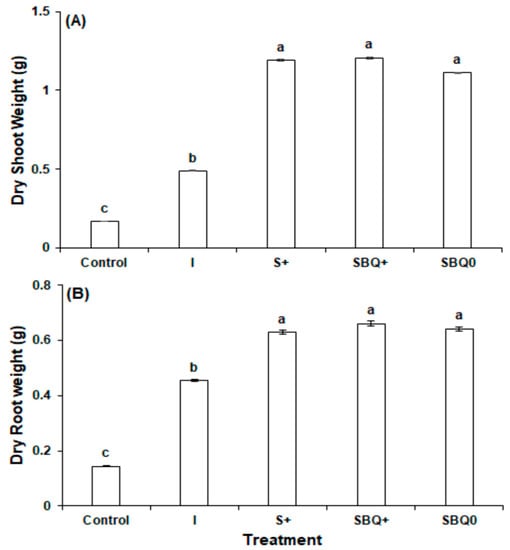 Compared to I, the biostimulant treatments statistically significantly (p < 0.01) increased biomass. The largest increase was in fresh shoot biomass, which increased by 216.2% in S+, 211.1% in SBQ+, and 190.3% in SBQ0 (Figure 3A). Consequentially, dry shoot biomass also increased by 143.5% in S+, 146.9% in SBQ+, and 127.1% in SBQ0 (Figure 4A). Root biomass also experienced significant benefits, but to a lesser degree than the shoot biomass metrics: Respectively, fresh root biomass (Figure 1B) and dry root biomass (Figure 2B) increased by 119.6% and 38.7% in S+, 143.4% and 45.6% in SBQ+, and 128.5% and 41.3% in SBQ0. The biostimulants markedly increased all biomass metrics.