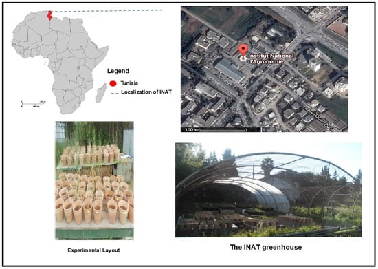 Sixty-four pots of soil (13.5 cm diameter × 20 cm height, 2 kg of soil) were placed in a semi-controlled greenhouse at INAT (36°49′ N, 10°10′ E) in Tunis (Tunisia) during the 2013–2014 growing season (Figure 1). The monthly air temperature ranged from 12 to 36 °C. The monthly relative humidity fluctuated between 58 and 68%. The soils were collected from clCMs and coLVs.