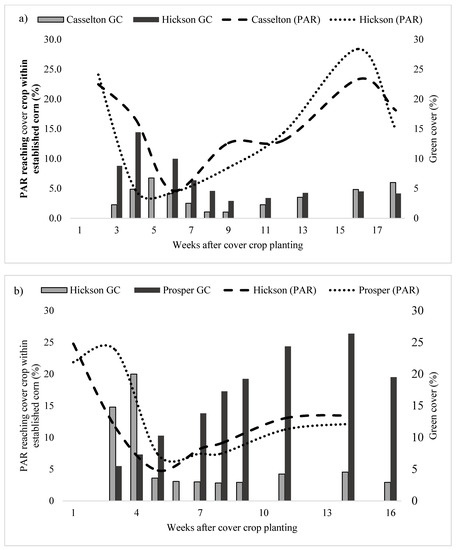 Percent green cover (GC) for cover crops planted at the V7 maize growth stage in relation to photosynthetically active radiation (PAR) reaching the cover crop canopy within the established maize at (a) Casselton and Hickson, ND, in 2018 and (b) Hickson and Prosper, ND, in 2019.