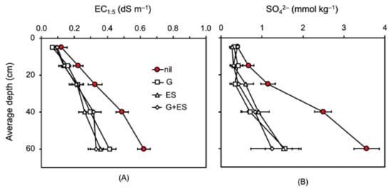 - Loveday, J. Relative significance of electrolyte and cation exchange effects when gypsum is applied to a sodic clay soil. Aust. J. Soil Res. 1976, 14, 361–371. [Google Scholar] [CrossRef]